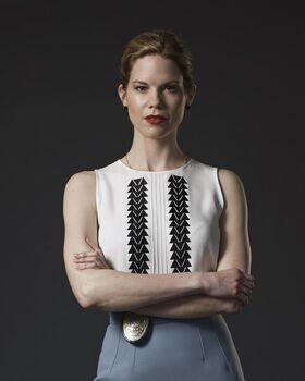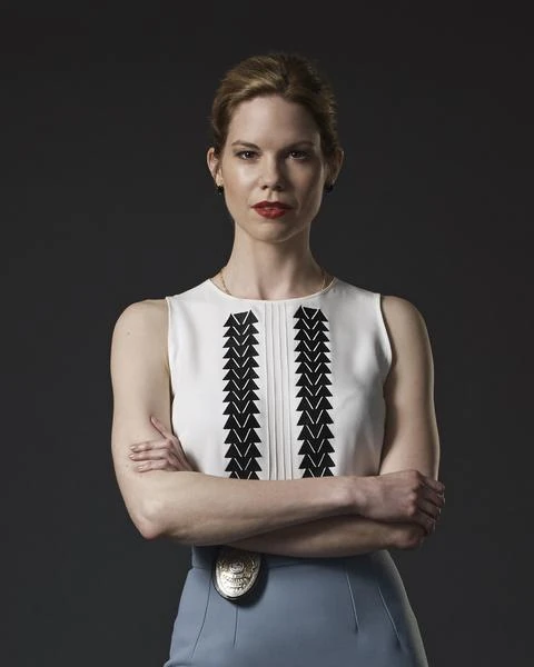 She usually wears a jacket over a thin top and navy pants along with black leather boots or heels. She either has her hair out of pinned along with a police belt around her waist and small blue earrings.